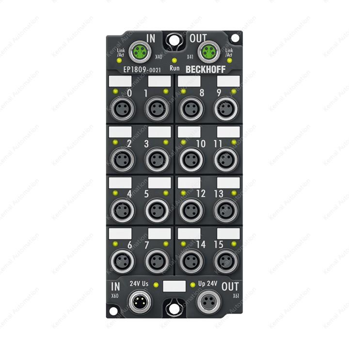 The EP1809-0021 EtherCAT Box with digital inputs acquires the binary control signals from the process level and transmits them, in an electrically isolated form, to the controller. The state of the signals is indicated by light emitting diodes. The signals are connected via M8 screw type connectors.